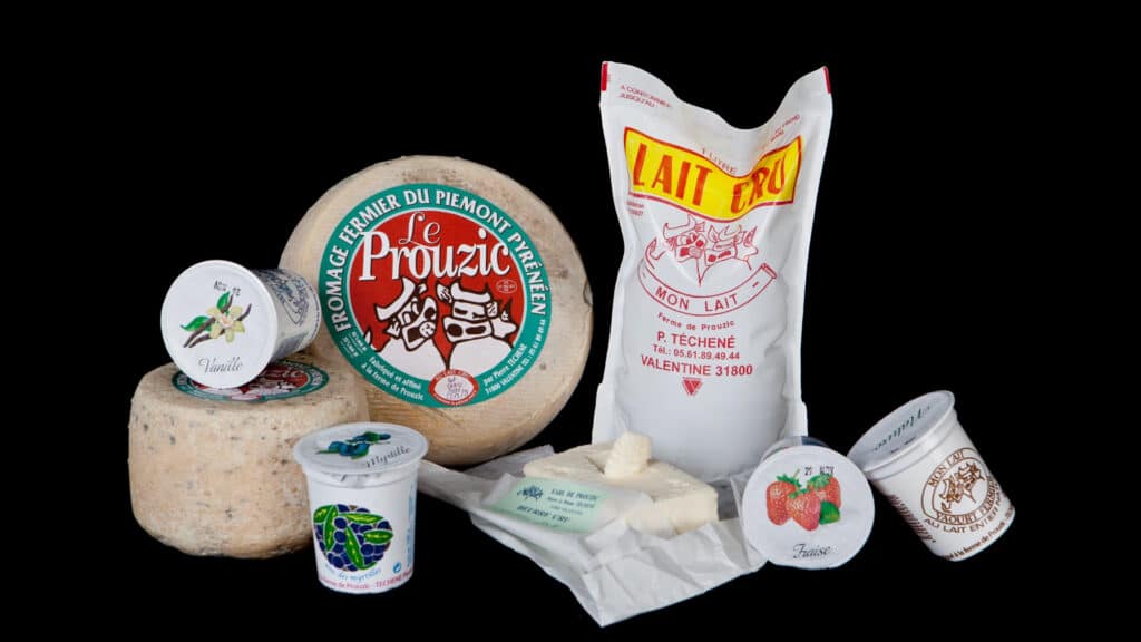 De nos vaches à votre cuillère. Ancrée dans le Piémont Pyrénéen, aux portes de Saint-Gaudens, la Ferme de Prouzic avec ses 60 vaches sur 120 ha, produit son lait et le transforme sur place en yaourts, fromage, fromage blanc, crème et beurre. Le lait du matin permet la fabrication du fromage et la mise en poche du lait cru, et le lait du soir est transformé en yaourts le lendemain.